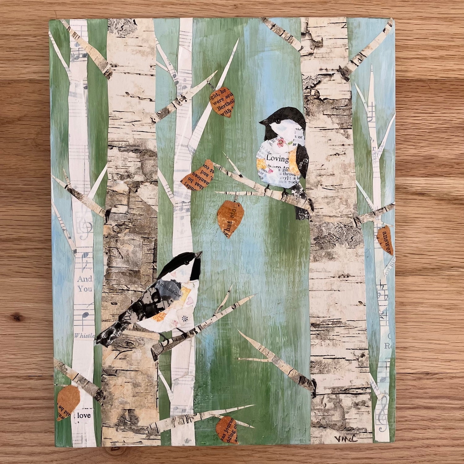 Original mixed media collage of Chickadee pair. Made with painted repurposed paper on 7x9 inch repurposed wood, ready to hang.