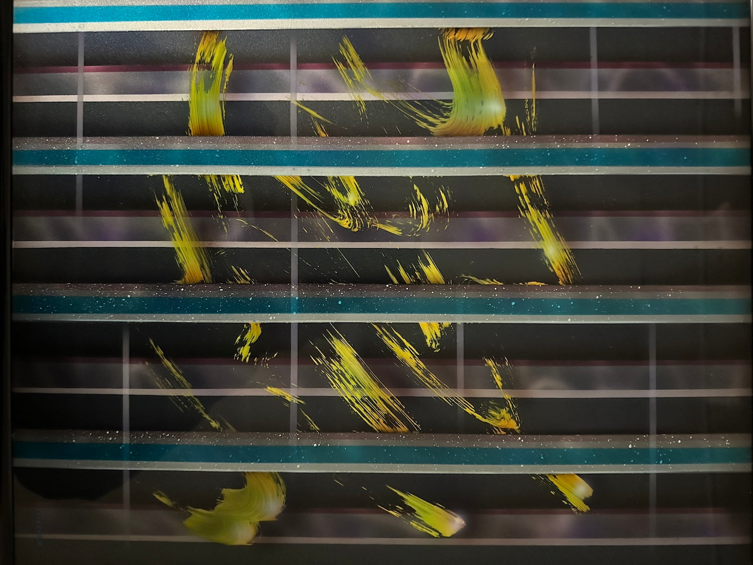 This piece is air brush art on an aluminum panel 12" x 18" . It has no deep meaning, just fun to do. I think it reminds me of the blinds I have in my home studio. by Mike Fischer at Blue Moose Art Gallery