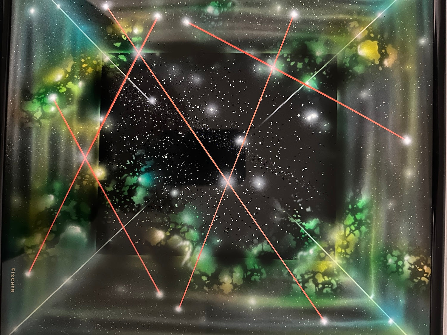 This piece is air brush art on an aluminum panel 12" x 12" . I love working with Fluorescent paint and a little is a lot ! Not overwhelming like poster art can be. by Mike Fischer at Blue Moose Art Gallery