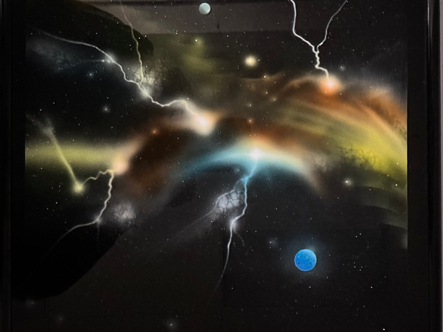 This piece is air brush art on an aluminum panel 12" x 12" Lightning doesn't exist in outer space as far as I know, but who cares, it was fun painting it.