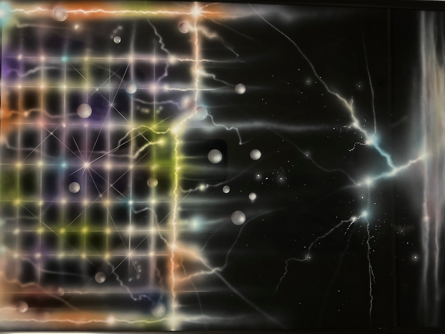 This piece is air brush art on an aluminum panel 12" x 18" This art is just having fun with fantasy thoughts of outer space.