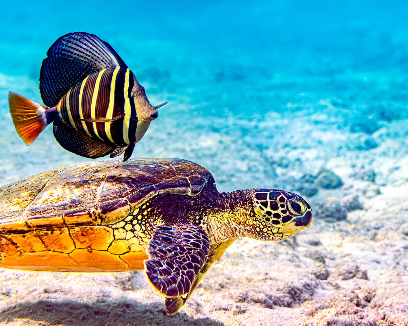 A Hawaiian green sea turtle floats in the glistening waters when a beautifully speckled Pacific Sailfin Tang glides next to her.