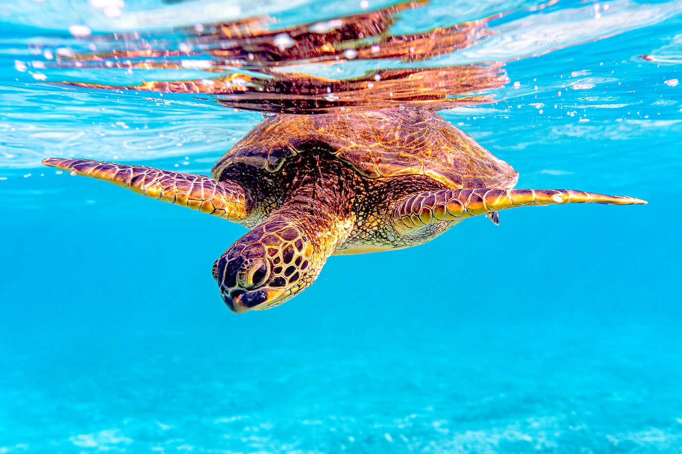 A Hawaiian green sea turtle was taking a breath after a mid-day snack and wanted to check out her reflection in my camera lens.