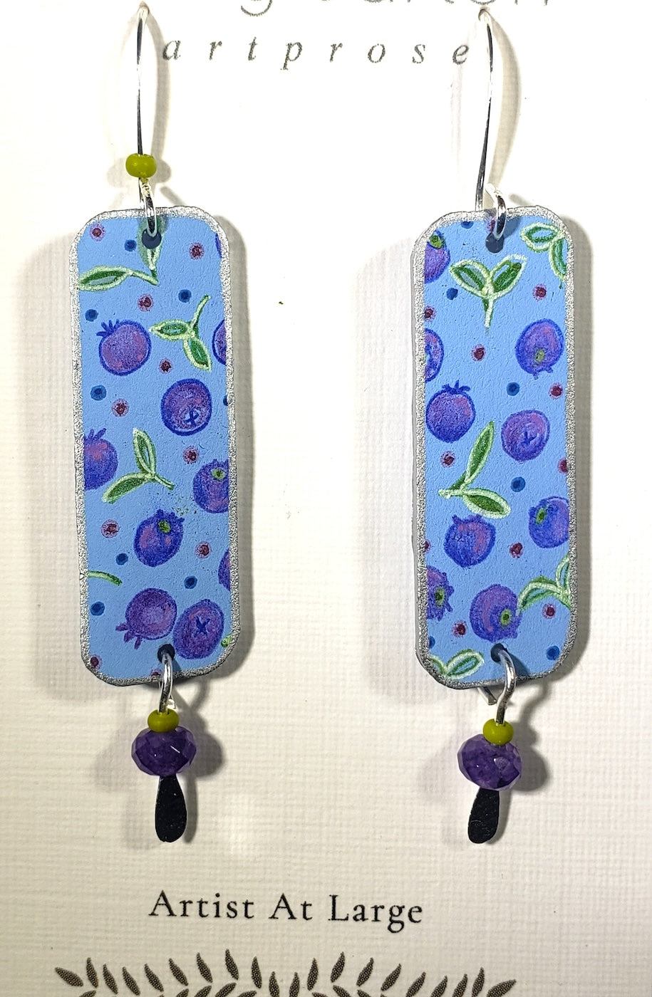 Blue background with cute little blueberries and leaves and purple faced glass beads by Ann Barton at Blue Moose Art Gallery