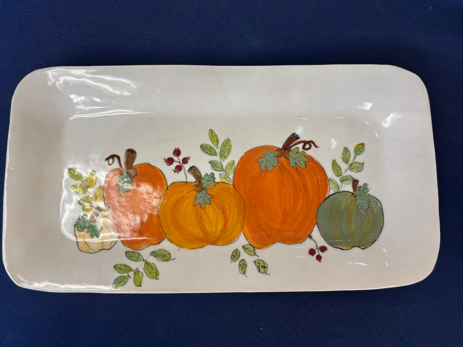 13 1/2 inch x 7 1/2 inch porcelain tray with pumpkins by Ruth Hand at Blue Moose Art Gallery
