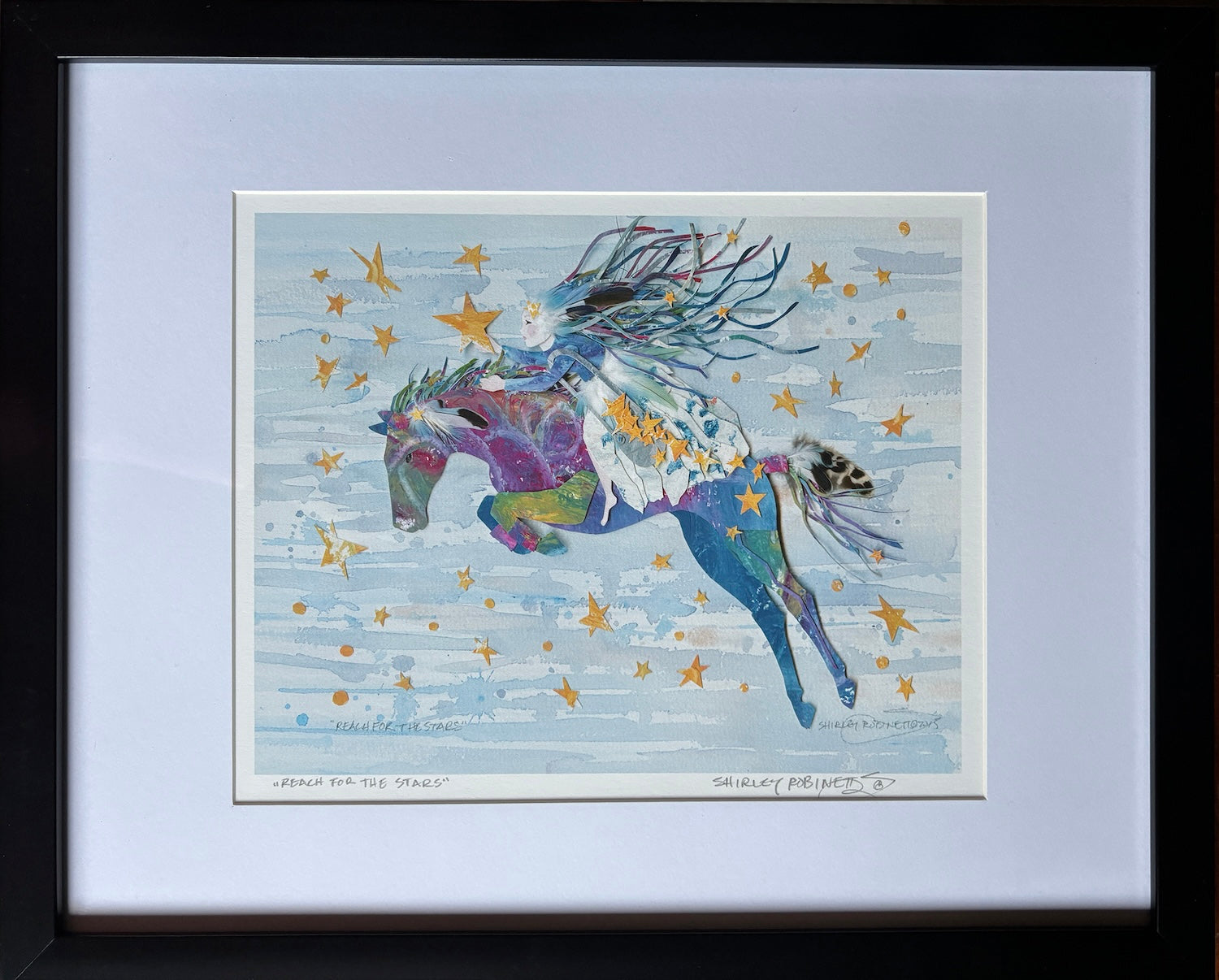 The story that inspired Reach for the Stars:  In the depths of my inspiration, I envisioned a girl leaping on a horse, reaching into the night sky and catching stars, encapsulating it into Reach for the Stars for the Reach fundraiser in February of 2016. Despite adoring it, I resolved to donate it. A few days before the auction, I received a call to visit my mother one last time. I traveled from Montana to Colorado to spend time with her. She passed on February 6 (the night of the auction). Unbeknownst to me, at the auction, my husband secretly bought back the original, knowing its profound significance to me. After all this time, it still remains a cherished keepsake, a symbol of love, loss, and the enduring bond between a mother and her daughter.