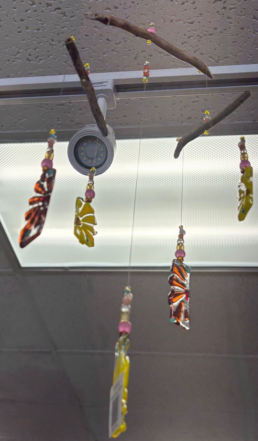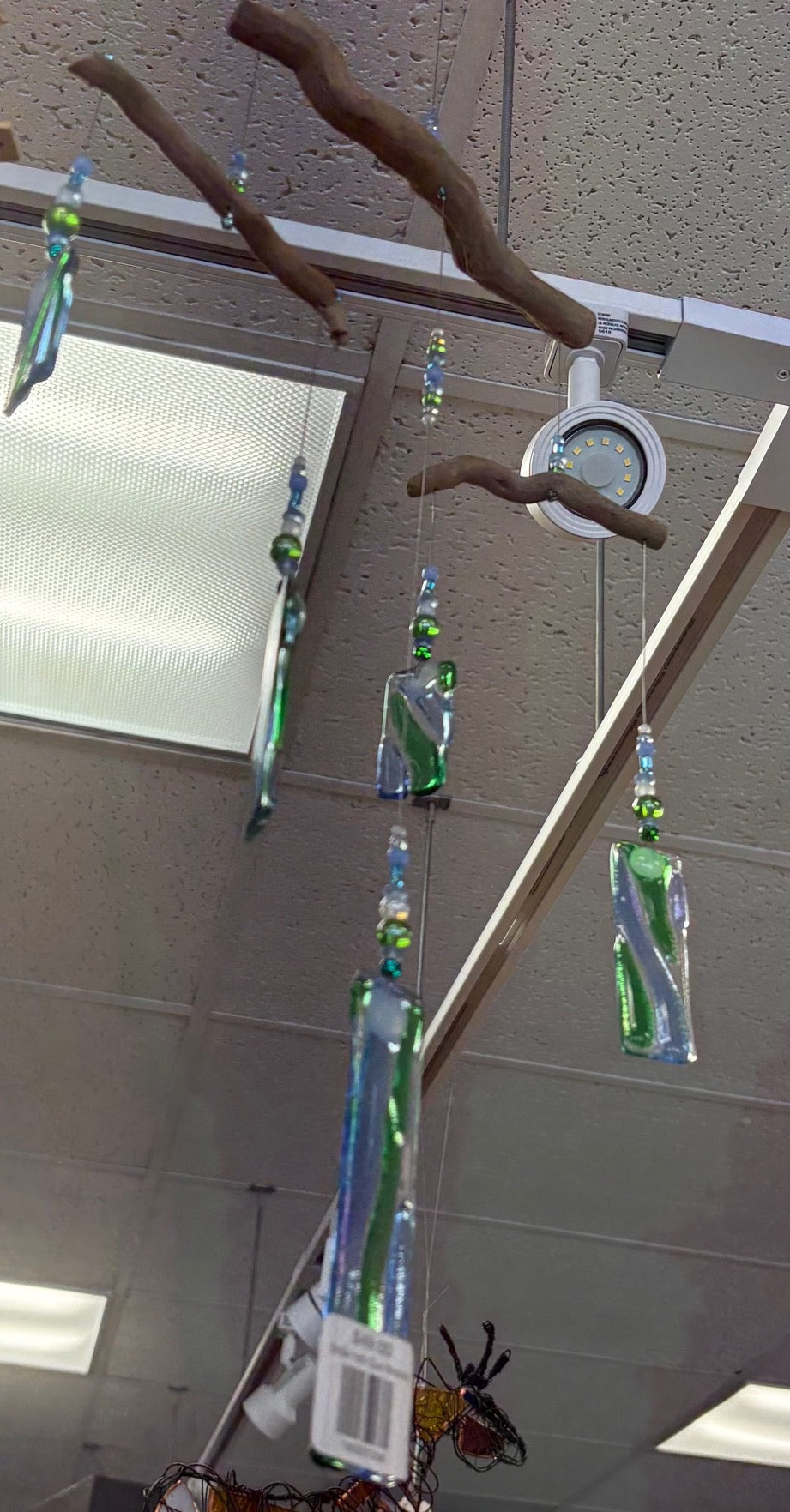 Mobiles with fused glass, beads and woodby Susie Morey at Blue Moose Art Gallery