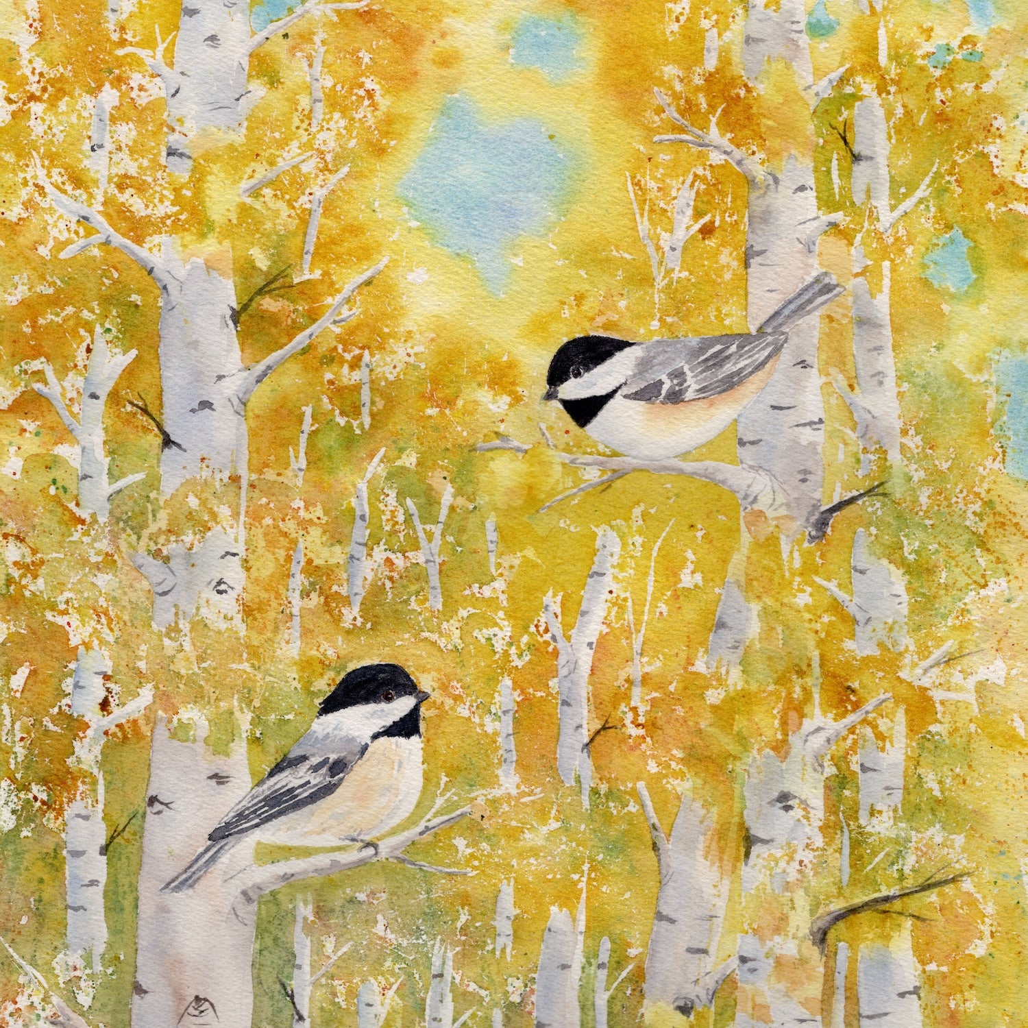 Original framed watercolor of two Chickadee birds in fall aspen trees. Image is 9x12 inches in brown wood frame, size 14x18 inches. by Vicki McCargar at Blue Moose Art Gallery