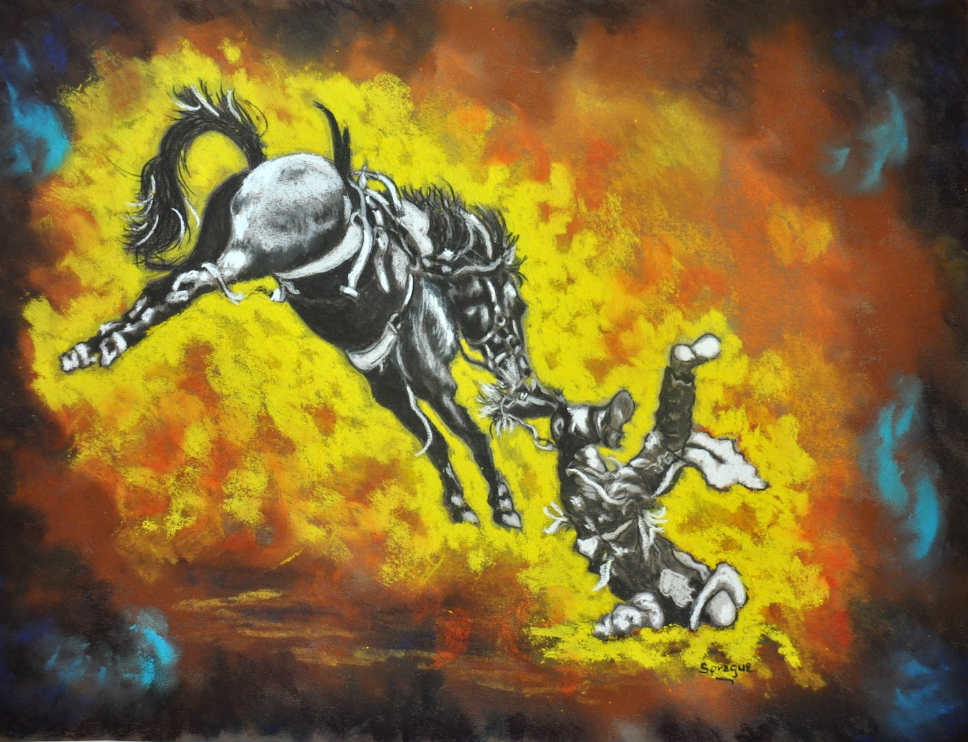 I go to rodeos and photograph cowboys in action. This one I thought must have really hit hard on the ground! These rodeo cowboys are such tough characters! This rodeo cowboy in action as been created in soft pastel on archival paper measuring 18x24 and custom framed to 22x28 overall.