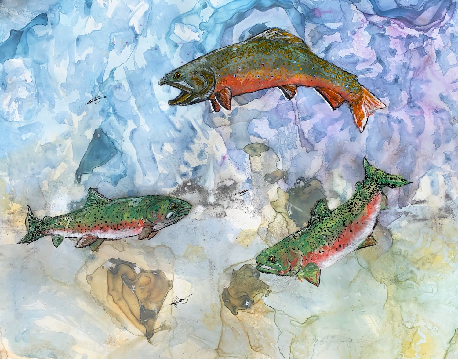 This is a large 3' x 4' mixed media drawing featuring a brook trout and rainbow trout pursuing some fly-fishing streamers under the water. It has a custom built pine frame.