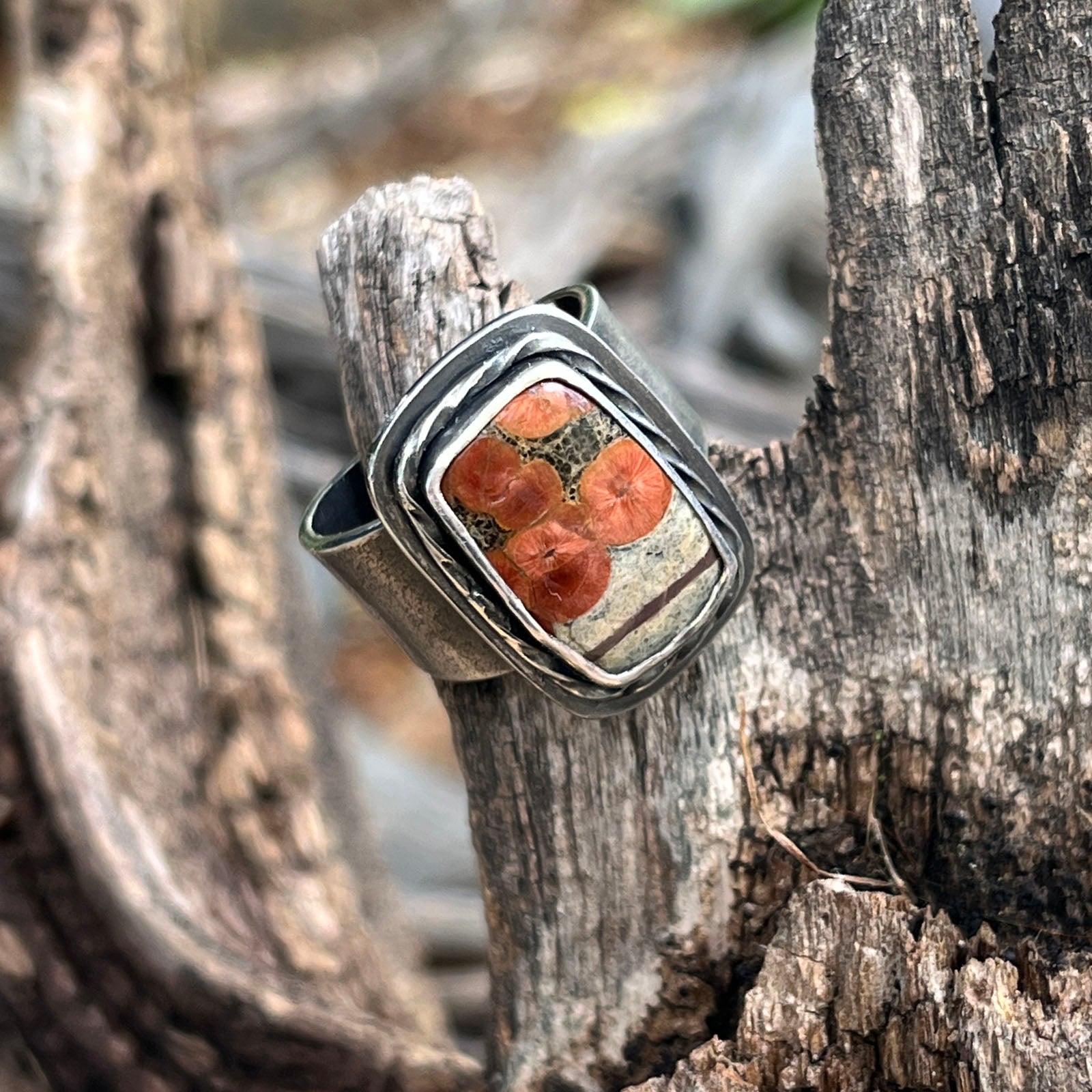 A 16 mm x 9 mm Peanut Obsidian is set in sterling silver with an open style comfort band design.