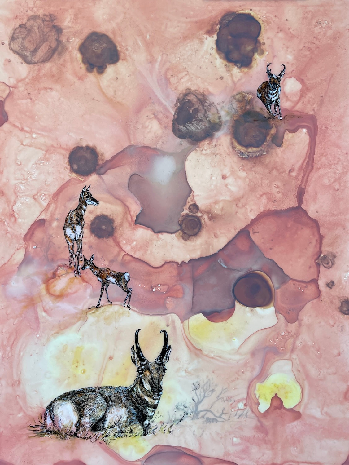 This stunning 18" x 24" ink drawing features a herd of pronghorn antelope. It is framed with a barn wood frame.