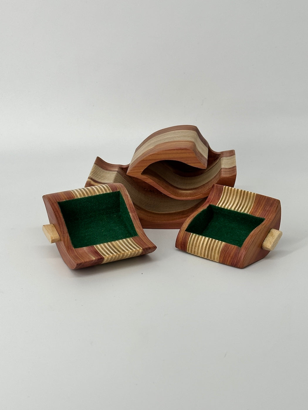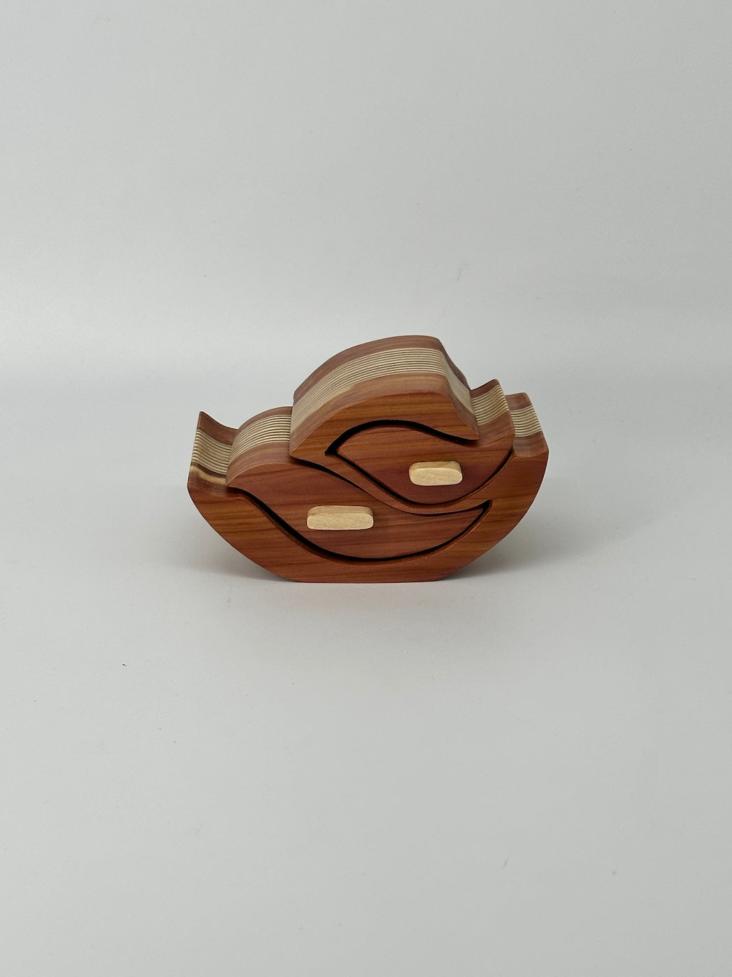 This beautifully cute and diminutive box measures only 5 inches long, 3 inches high and 3 inches deep but - as well as being cute - is a beautifully crafted and striking piece of art suitable for any display. It is made of aromatic Cedar with Baltic Birch plys and has handles of Primavera wood.