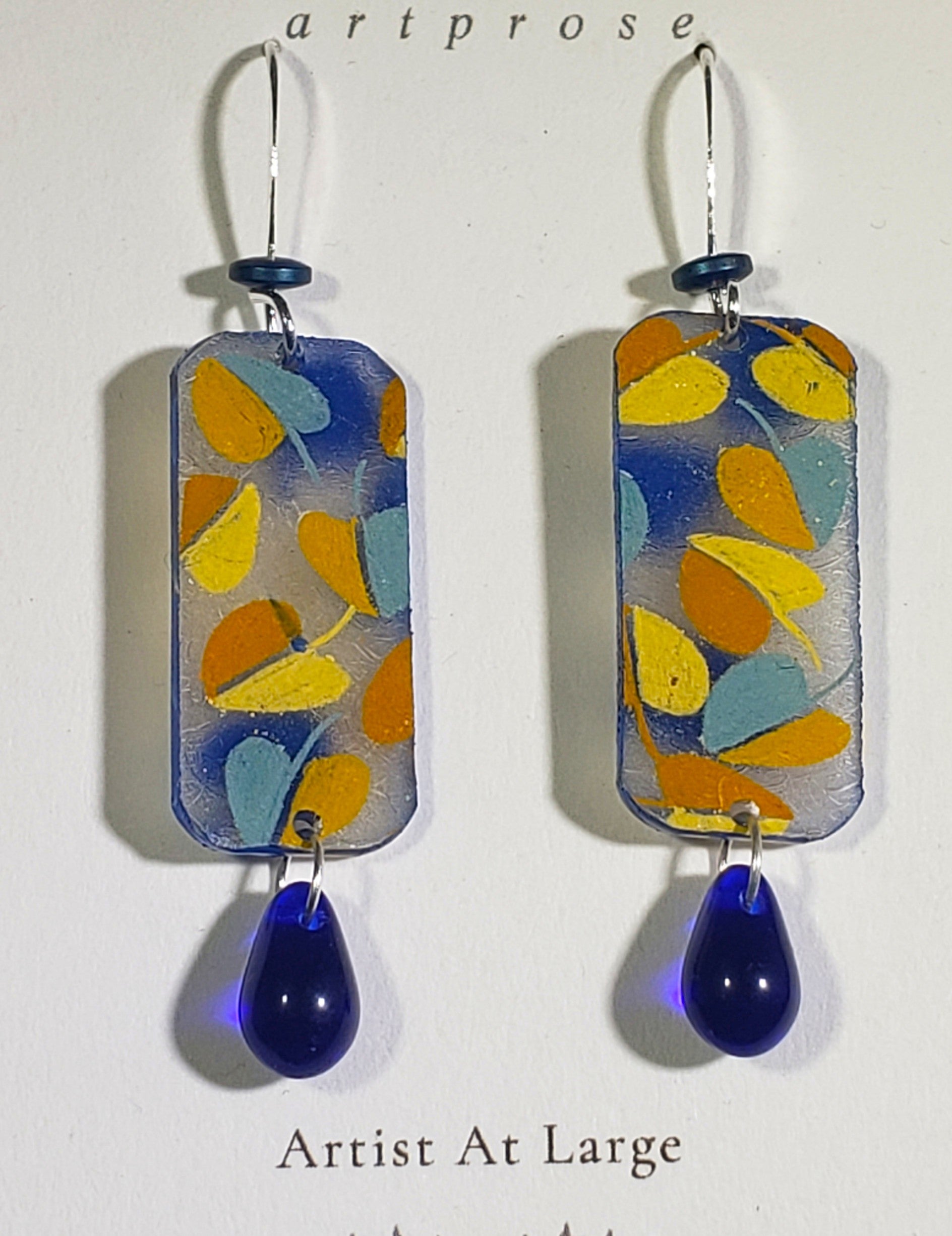 Gold and slate blue leaves with cobalt glass teardrop beads by Ann Barton at Blue Moose Art Gallery