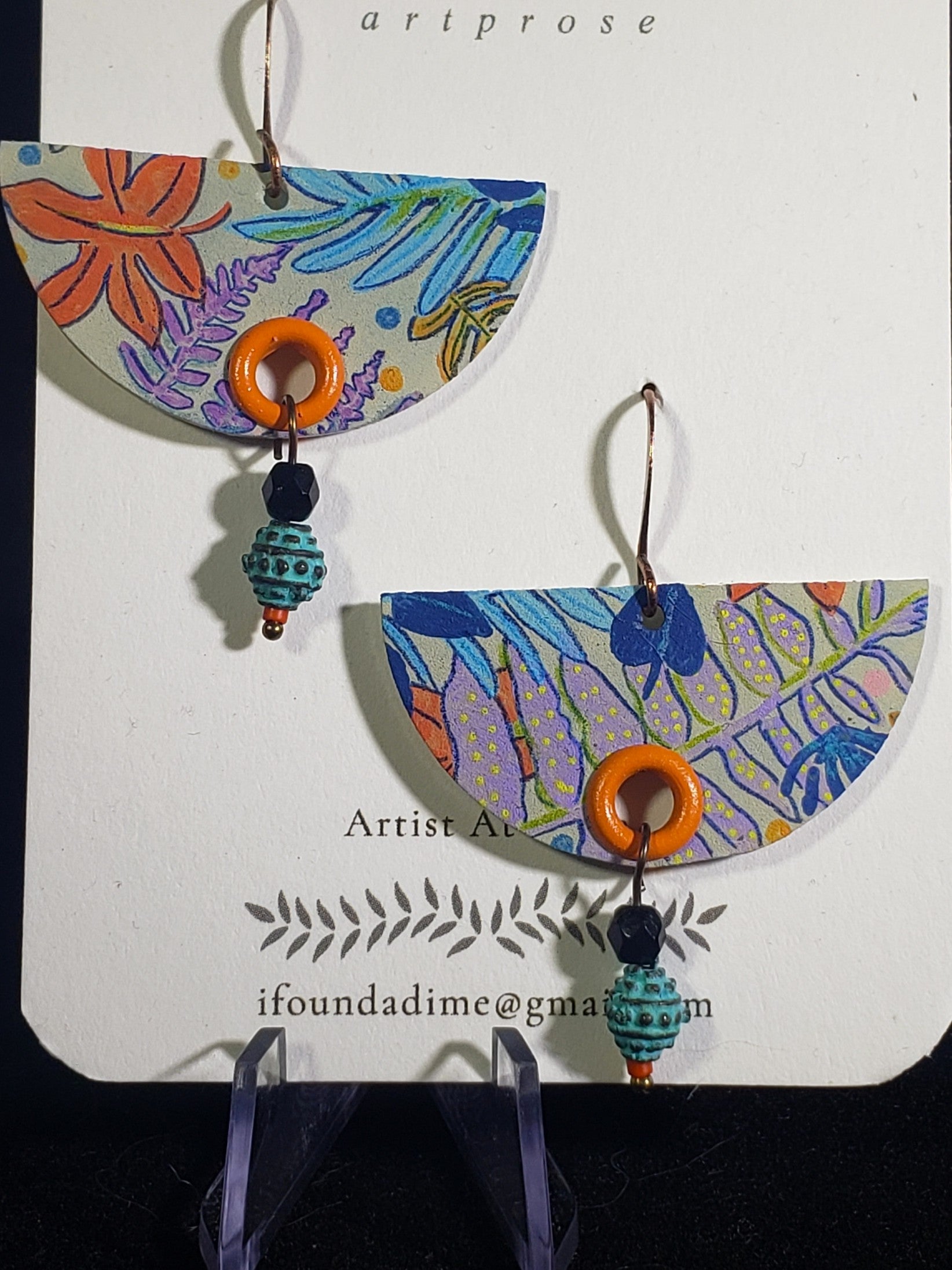 Half circle shrink film earrings with ferns and Fall leaves and orange grommets by Ann Barton at Blue Moose Art Gallery