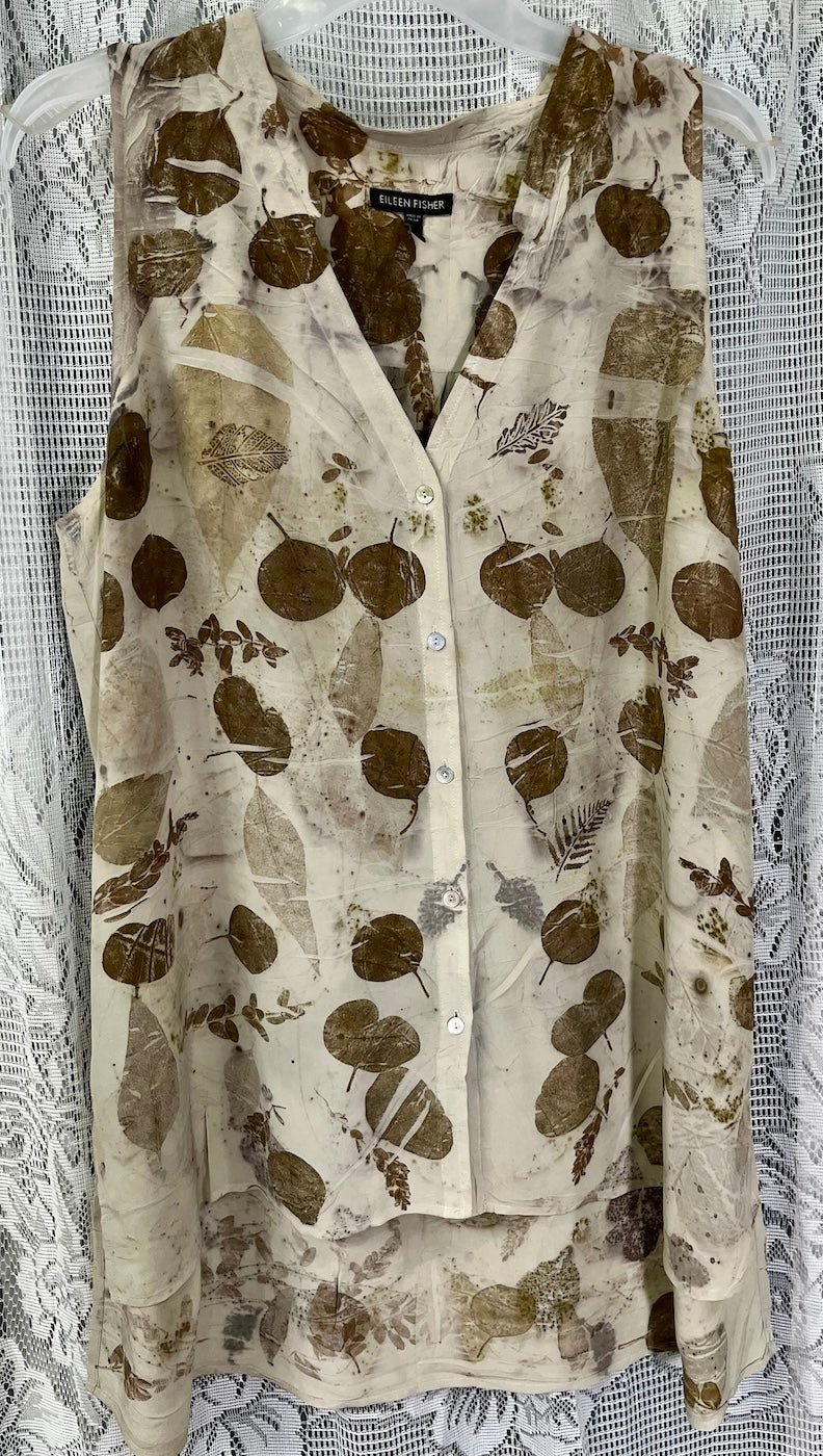 Up-cycled Eco dyed and printed silk blouse. CARE: Hand wash in warm water with ph neutral detergent. Line dry or place in dryer on delicates. Iron on silk setting. by Paula Morris at Blue Moose Art Gallery