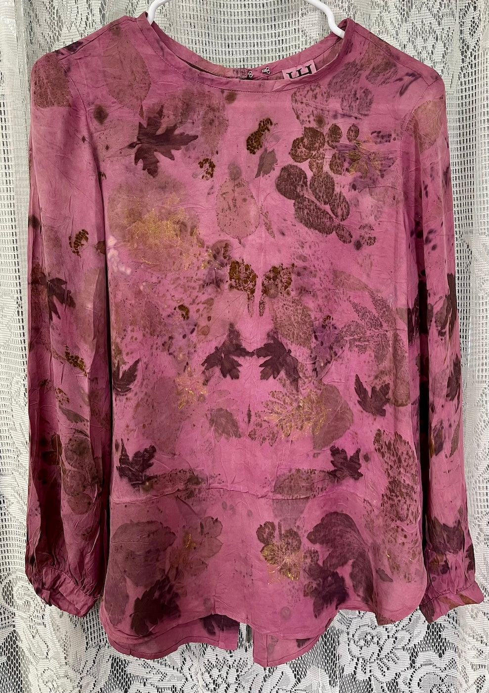 Up-cycled Eco dyed and printed silk blouse. CARE: Hand wash in warm water with ph neutral detergent. Line dry or place in dryer on delicates. Iron on silk setting. by Paula Morris at Blue Moose Art Gallery