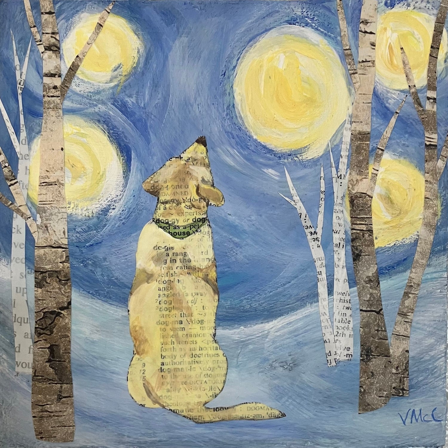 Mixed media collage on repurposed wood of Yellow Labrador Retriever. Size 5.5 x 5.5 inches.