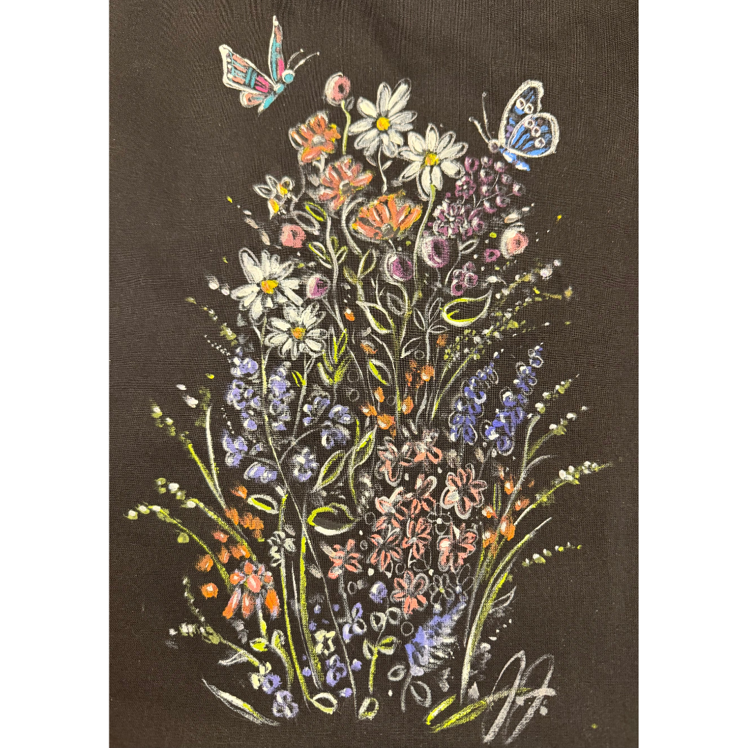 Create a stunning, functional piece of art in this relaxing and inspiring tote-bag acrylic painting class. In this workshop, you’ll paint a 100% cotton black tote bag (15”x 16”) featuring delicate wildflowers accented with two butterflies and a honeybee – a timeless, nature – inspired design that’s both elegant and joyful.